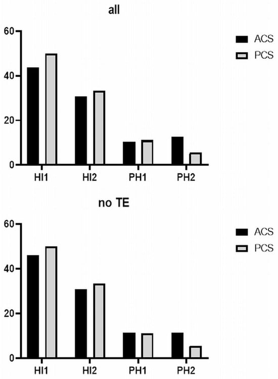 In the entire cohort, a total of 57 patients (22.5%) developed HT (Table 2). The incidence was slightly lower in the ACS group than in the PCS group, with n = 39 (21.0%) versus n = 18 (26.9%), respectively. When comparing the incidence of the specific subtypes of HT according to the ECASS II classification, PCS patients had higher incidences of HI-1, HI-2, and PH-1 compared to ACS patients, but PH-2 was more common in ACS patients (Table 2, Figure 1). The influence of thrombectomy on the occurrence of HT and its severity was also investigated. There was no difference in the incidence of HT or the distribution of the different ECASS II types in all patients depending on whether it was ACS or PCS. No differences were observed between ACS and PCS patients in the overall incidence of HT or patients treated with thrombectomy or conservative (antiplatelet) treatments. However, when considering ACS and PCS patients who did not receive thrombectomy, there was a significantly greater proportion of PCS patients who developed HT compared to ACS patients (p = 0.040) (Table 2).