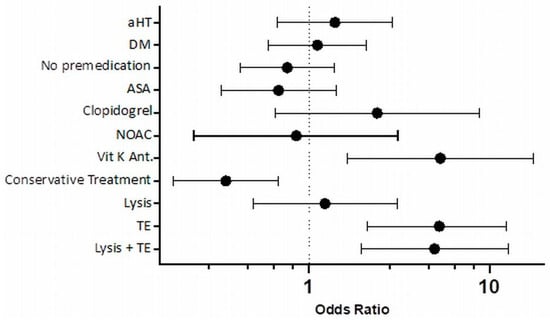 Forest plot depicting the odds ratio (solid black circle) and 95% confidence interval (whisker) of HT risk attributable to various possible risk factors. aHT: arterial hypertension, ASA: acetylsalicylic acid, DM: diabetes mellitus, HT: hemorrhagic transformation, NOACs: new oral anticoagulants, TE: thrombectomy Vit K Ant.: vitamin K antagonists.