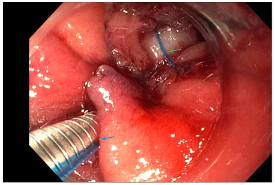 Upper endoscopy reveals the use of a suturing system (arrow, blue) with a suture in place (arrow, green) at the leak site in a patient following sleeve gastrectomy.