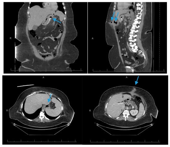 Lateral and transverse (top left and top right) views of a computed tomography scan of the abdomen and pelvis reveals air-fluid collections adjacent to the fundus of the stomach (3.3 × 3.0 cm) (arrow, top left), anterior to the stomach (2.2 × 4.6 cm) and in the epigastric region of the abdominal wall (6.2 × 3.0 cm) (arrows, top right), which likely represents abscesses in the setting of staple line dehiscence. Axial views of the computed tomography scan of the abdomen and pelvis (bottom left and bottom right) redemonstrate the somewhat ill-defined collection of gas and (arrows, bottom left and bottom right) fluid likely due to focal dehiscence and an abscess cavity which is the source of a gastrocutaneous fistula.