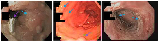 Upper endoscopy reveals an inflammatory mucosal reaction (blue arrows; left, middle and right) following the removal of a partially covered, esophageal self-expandable metal stent used for the treatment of a staple line leak in a patient with a sleeve gastrectomy. The patient reported severe regurgitation and chest pain associated with the stent. A through-the-scope clip (purple arrow, left) was used to anchor the removed stent.
