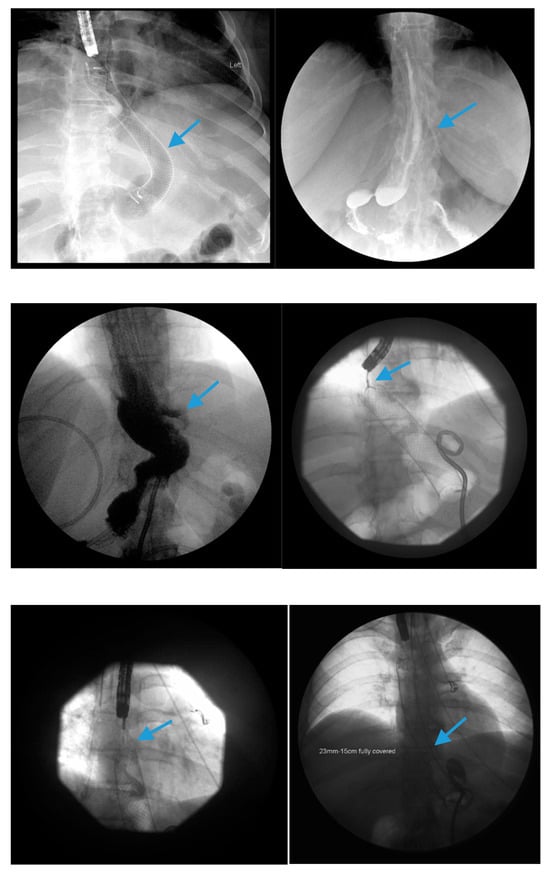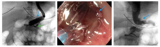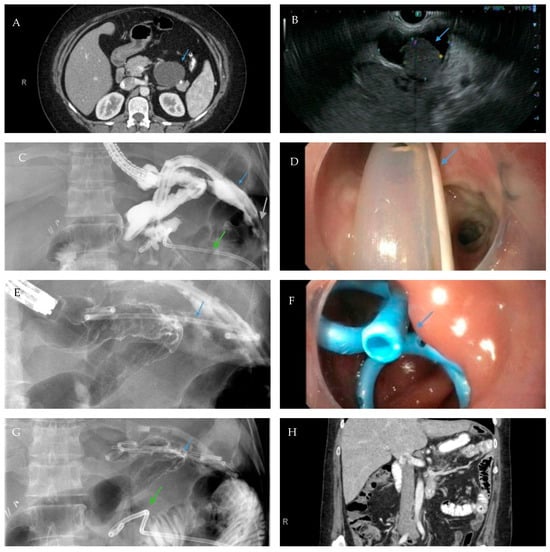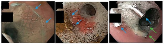- Toh, B.C.; Chong, J.; Yeung, B.P.; Lim, C.H.; Lim, E.K.; Chan, W.H.; Tan, J.T. Endoscopic internal drainage with double pigtail stents for upper gastrointestinal anastomotic leaks: Suitable for all cases? Clin. Endosc. 2022, 55, 401–407. [Google Scholar] [CrossRef] [PubMed]