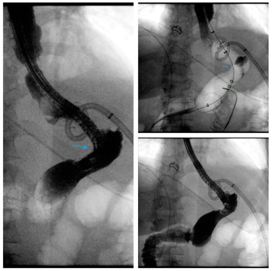 - Gopakumar, H.; Puli, S.R. Modified peroral endoscopic myotomy for non-helical-type gastric sleeve stenosis after laparoscopic sleeve gastrectomy. Gastrointest. Endosc. 2024, 99, 287–288. [Google Scholar] [CrossRef] [PubMed]