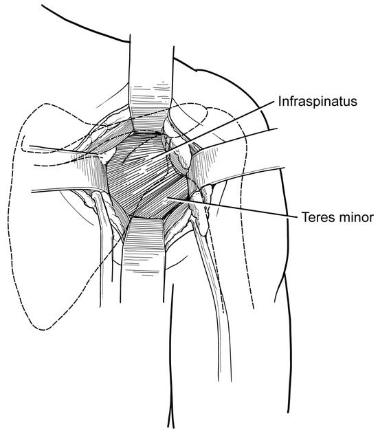 After the division of the skin and subcutaneous tissue, the deltoid is identified and retracted superiorly. The fascia overlying the infraspinatus muscle can then be visualized. The fascia is opened in line with the muscle fibers, which allows for access to the interval between the teres minor and the infraspinatus.