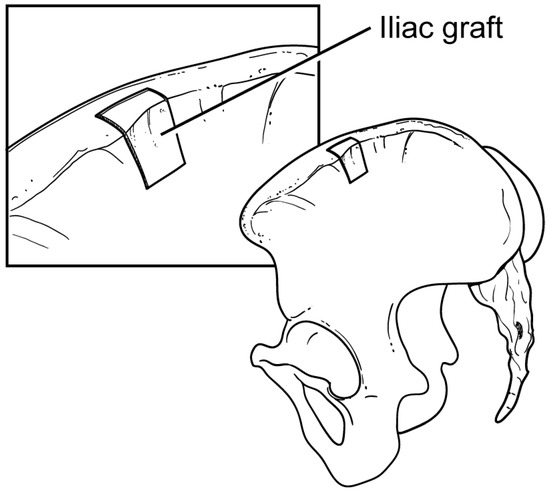 Prior to harvesting the bone block, the size of the glenoid defect is approximated so that the appropriate graft size can be taken. The bicortical iliac crest bone graft is taken from the superior and lateral cortices of the ilium, leaving the inner table intact.