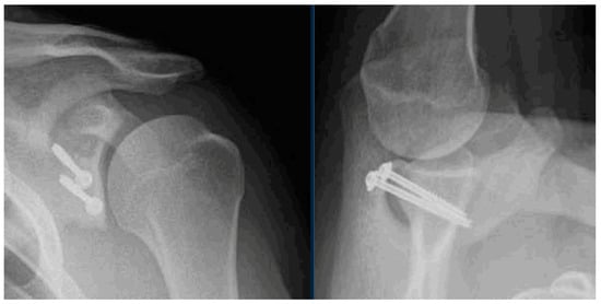After surgery, the patient is placed in a simple sling for approximately two weeks. Post-operative radiographs are obtained at the first post-operative visit to ensure proper graft and hardware positioning (Figure 6). Physical therapy is initiated after the first post-operative visit, with a focus on gentle passive and active–assisted range-of-motion exercises. Internal rotation and adduction should be avoided to minimize the early loading of the bone graft. We prefer an aquatic therapy exercise regimen if possible. Active strengthening is initiated at twelve weeks, and return to sport is typically permitted at 4 to 6 months post-operatively.