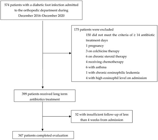 We scanned electronic medical records to identify all adult patients hospitalized in the orthopedic department at Soroka University Medical Center for a diabetic foot infection, from December 2016 to December 2020. Eligible patients were those who had a diabetic foot ulcer grade ≥ 3, according to the International Working Group of the Diabetic Foot/Infectious Diseases Society of America classification for foot infections in persons with diabetes [13] requiring treatment with an antibiotic (oral/intravenous) for at least two consecutive weeks. Definitive antibiotic treatment was prescribed according to microbiological data, based on wound specimen cultures, which included bone biopsies in 74% of patients and deep tissue biopsies or pus in 25% of patients [10]. Exclusion criteria included patients with eosinophilia (as defined below) on their admission baseline complete blood count (CBC) drawn on the day of hospitalization, patients treated with immunomodulatory drugs (e.g., corticosteroids, colchicine), and those with a chronic diagnosis of asthma or atopic allergy. Patients were assessed for laboratory test results at two-week intervals during a follow-up period of up to six weeks, starting from admission. Patients included in the analysis had at least two differential CBC measurements taken on admission and two weeks later. Patients were followed by the infectious diseases service during hospitalization and post-discharge in the setting of an outpatient infectious diseases clinic up to six weeks following discharge, parallel to their follow-up in the orthopedic clinic.