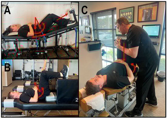 (A–C) Chiropractic BioPhysics® structural spinal rehabilitation Mirror Image® spinal traction, therapeutic exercises, and chiropractic adjustment. The red arrow represents prescribed movements/forces for MI structural spinal rehabilitation treatment using CBP® protocols. All therapies involved reducing lumbar lordosis by leveraging the pelvis into flexion (-RxP) to induce lumbar flexion reducing the L5 anterolisthesis (A) MI spinal traction including lumbar decompression; (B) MI spinal exercises; and (C) MI chiropractic adjustments.