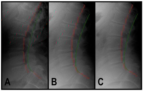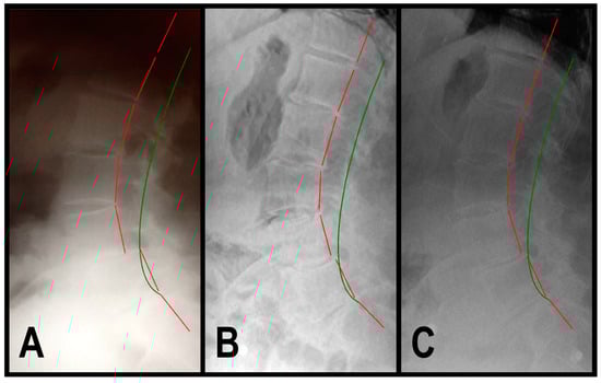 The radiographs of the patients were examined using the Harrison posterior tangent method (HPTM) [34]. Lateral lumbar (LL) radiographs are used to measure regional and intervertebral lumbar angles and translations. Lumbar angles are determined by drawing a tangential line to the posterior aspect of each vertebral body from T12 to S1. The absolute rotation angle (ARA) is assessed for spinal regions (e.g., ARA L1-L5). Intervertebral AP translations are determined by measuring the perpendicular distance from the posterior tangent line of the inferior vertebra to the posterior, inferior aspect of the superior vertebra. All measurements and lines are compared to established, evidence-based, and normative values.