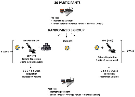 A total of thirty women volleyball players volunteered to participate in the study and they were stratified into three groups: NHE group (n = 10), NHE + BFR group (n = 10), and CG (n = 10). The CG continued their regular volleyball training while the other two groups, in addition to volleyball training, performed NHE on three designated days of the week. The NHE + BFR group, unlike the NHE group, performed the exercises in combination with the BFR method. The study was completed in a 9 week period with pre-test and post-test measurements. Measurements were taken in the first week and the last week. The training programs were implemented for 6 weeks, excluding the 1-week anatomical adaptation period. The training volume was calculated by multiplying the number of sets by the number of repetitions in the NHE and NHE + BFR groups during the 6 weeks of training. While calculating the training volume, the steps described in the exercise protocols section were observed by the researcher and noted based on the number of repetitions successfully performed by the participant. In order to determine the specific effects of the NHE in the study, the training loads and rest intervals of all participating players during their routine volleyball training sessions were set to be similar to each other (Figure 1). In addition, routine volleyball training was based especially on technical and tactical exercises during this period.