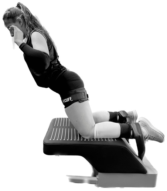 It has been stated that the absolute pressure that occurs after the cuff is attached to the circumference of the limb in exercises performed with the BFR method may lead to a vascular restriction in different degrees from person to person, depending on individual blood pressure, anthropometric characteristics, and cuff width [14]. Considering this situation, LOP was determined with the help of Doppler to determine the participant’s limb occlusion pressure (LOP). The cuff was tied to the proximal part of the participants’ thigh in the position where the motion form would be applied, and it was inflated with an inflation pump to 50 mmHg for 30 s and then reset for 10 s. Subsequently, the inflation–deflation cycle was continued with increments of 10–20 mmHg, gradually increasing the pressure until the pulse was no longer detectable. During this process, the audible signal of the pulse was listened to using a Doppler probe placed on the tibialis posterior artery. The LOP was determined as the point where the audible pulse signal was no longer detected. In the NHE + BFR group, the exercise sessions were performed at a number of repetitions equivalent to 70% of the individually determined LOP, up to three sets until failure with a 2 min rest between sets. The commonly used repetition scheme in the BFR method is typically 30-15-15-15, which has been reported to provide sufficient repetition volume for most individuals to induce the necessary adaptations [6]. However, in our study, we employed a repetition method where the participants performed repetitions until the failure set, reaching a point where they could no longer complete a repetition [15,16,17]. It has been suggested that performing repetitions until a failure set is necessary to induce strength adaptations in certain populations, such as players [6].