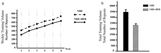 The training volume of NHE and NHE + BFR groups. The training volume data are displayed as the number of repetitions. (a) Weekly training volume; (b) 6 week total training volume.