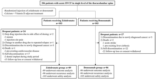 Zoledronic acid and denosumab, which are injected yearly and every 6 months, respectively, are both widely used as primary bone resorption inhibitors for osteoporosis, owing to their safety, effectiveness, and patient convenience [8]. Previous studies comparing their safety and effectiveness have confirmed that the two drugs are similar or that denosumab has slightly better effects, which remains controversial [9,10,11]. However, few randomized controlled trials (RTCs) have compared these two drugs for the preventive effect of OVCF recurrence and clinical outcomes in a practical patient with acute OVCF.