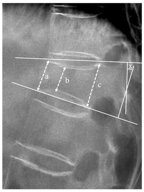 Lateral plain radiograph displaying measured factors. The mean height of the vertebral body was defined as the average of anterior margin (a), minimal height (b), and posterior margin (c) of the vertebral body, expressed as (a + b + c)/3. The vertebral height ratio (%) was calculated using the following equation: () × 100. The segmental angle (X) was measured as the angle formed by lines drawn along the superior and inferior plateaus of the vertebral body, where they intersect.
