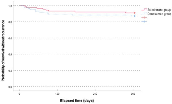 The median time to recurrence was not significantly different between the two groups (79.0 [range, 17.0–336.0] days in the zoledronate group and 50.0 [range, 14.0–355.0] days in the denosumab group, p = 0.481, non-parametric Mann–Whitney test). The Kaplan–Meier survival analysis showed no significant difference between the two groups (p = 0.407, log-rank test) (Figure 3).