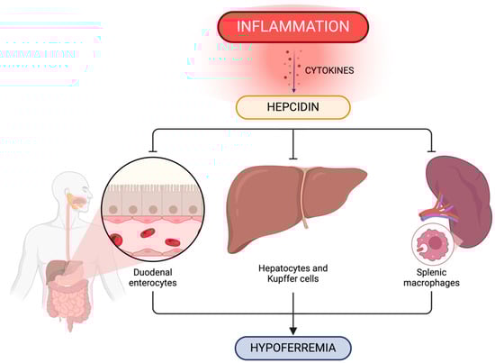 Inflammation impact on the regulation of systemic iron metabolism. Hepcidin plays a crucial role in systemic iron level control via ferroportin concentration in iron-exporting cells including duodenal enterocytes, hepatic and splenic iron-recycling macrophages and hepatocytes. Created with BioRender.com (accessed on 9 March 2024).