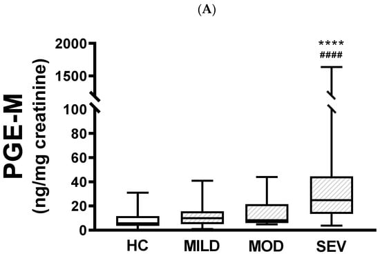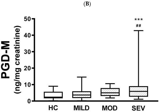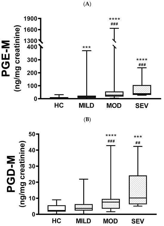 Urinary PGE-M and PGD-M levels and clinical severity. PGE-M (Panel A) and PGD-M (Panel B) concentrations were analyzed by liquid chromatography/tandem mass spectrometry (LC/MS) in urine samples from healthy controls (HC, N = 30) and patients with mild (MILD, N = 29), moderate (MOD, N = 7), and severe (SEV, N = 65) clinical phenotypes. The solid line indicates the median, the box indicates 25–75th percentiles, and whiskers represent the minimum and maximum values. An unpaired t-test was used for statistical comparison. **** p ≤ 0.0001 and *** p ≤ 0.001 compared with HC; ### p ≤ 0.001 and ## p ≤ 0.01 compared with MILD.