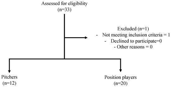 There were 32 male college baseball players who met these exclusion and inclusion criteria. Participants’ characteristics are shown in Table 1. Their mean age was 20.5 ± 1.6 years (range, 19–24 years); 12 were pitchers; and 20 were position players. The mean length of their baseball career was 10.1 ± 2.9 years (range, 5–15 years).