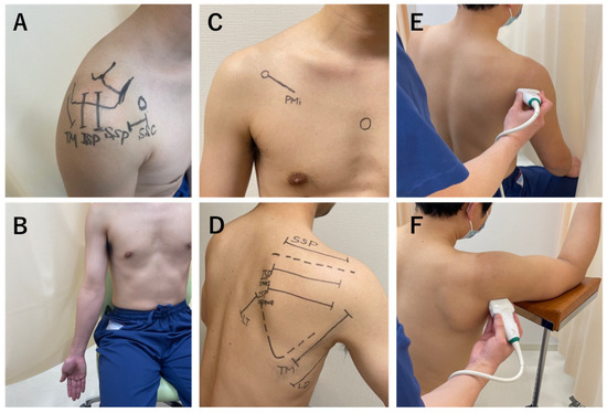 Measurement points for the shear wave elastography (SWE) examinations. (A) Probe placement for each tendon; SSC, subscapularis; SSP, supraspinatus; ISP, infraspinatus; TM, teres minor. (B) Posture and site for measurement of SSC tendon stiffness. The participant was scanned along the tendon with the upper extremity in a 45° external rotation position with the upper extremity drooped. (C,D) Probe placement for each muscle; PMi, pectoralis minor; SSP, supraspinatus; ISP trans, the transverse part of the infraspinatus; ISP oblique, the oblique part of the infraspinatus; TM, teres minor; LD, latissimus dorsi; LT, lower trapezius. Positioning of the participants during SWE examination of the posterior capsule (E) and the posteroinferior capsule (F).