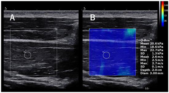 SWE was measured using an Aixplorer (Supersonic Imagine, Aix-en-Provence, France). The examinations were performed by a single shoulder surgeon with 6 years of experience who is experienced with the ultrasound technique. Subjects were examined using SWE to assess the elasticity of muscles and associated components in the shoulder region, including the supraspinatus (SSP) tendon, infraspinatus (ISP) tendon, subscapularis (SSC) tendon, teres minor (TM) tendon, SSP muscle, ISP muscle transverse part, ISP oblique part, TM muscle, lower trapezius (LT) muscle, latissimus dorsi (LD), pectoralis minor (PMi) muscle, posterior capsule, and posteroinferior capsule. When measuring the SSP tendon, ISP tendon, and TM tendons, the participants were scanned in a seated position with the throwing arm relaxed (forearm resting on the ipsilateral thigh) along the tendon. When measuring the SSC tendon, the participants were scanned along the tendon with the upper extremity in a 45° external rotation position with the upper extremity drooped (Figure 2B). When the probe was applied to the supraspinatus fossa, the trapezius muscle was identified in the superficial layer and the SSP muscle was observed beneath it. The ISP transverse and oblique parts were scanned along the muscle fibers positioned 1 cm and 2 cm from the center of the scapular spine, respectively [20]. For the low trapezius muscle, the lateral edge of the transducer was placed 5 cm below the root of the spine of the scapula, and the body of the transducer was inclined at approximately 55° to appear on the long axis of the muscle, as described in a previous study [21]. The LD was scanned by placing the probe parallel to the muscle fibers at three fingerbreadths distal to and along the posterior axillary fold [22]. When the probe was placed medial to the coracoid process, the PMi muscle, which is attached to the coracoid process, was observed beneath the pectoralis major muscle. The measurement site of the PMi was defined as the midpoint between the coracoid process and the fourth rib and sternum junction [23]. The location of the transducer was adjusted to clearly visualize the humeral head, glenoid rim, labrum, and ISP, and the elasticity of the posterior capsule beneath the ISP was measured 5 mm lateral to the edge of the labrum. The location of the transducer was adjusted to clearly visualize the humeral head, glenoid rim, labrum, and TM muscle, and the elasticity of the posteroinferior capsule was measured in the same manner as the measurements of the posterior capsule (i.e., at a location 5 mm lateral to the edge of the labrum) [24]. SWE measurements of the SSP tendons, ISP tendons, TM tendons, and SSC tendons were taken just above the medial border of the tendon attachment. Figure 2 shows the probe placement for each muscle; all muscles were scanned along the long axis, displaying B-mode images. A color-coded box showing the shear elastic modulus was superimposed on the B-mode ultrasound image, and the circular region of interest was set near the central part of the muscle (Figure 3). We performed each measurement twice and used the mean of the two values for the analysis.