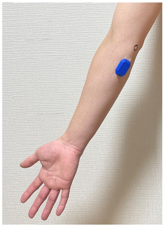 Placement of the inertial measurement unit sensor using double-sided adhesive instead of the provided sleeve. The circle in the figure is the medial epicondyle of the humerus.