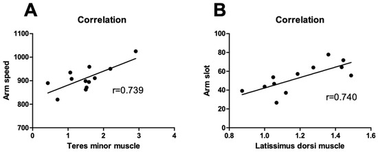 Correlations between throwing motion analysis and SWE ratios in the pitcher group. There was a positive correlation between arm speed and the SWE ratio of the teres minor muscle (A) and a positive correlation between arm slot and the SWE ratio of the latissimus dorsi muscle (B).