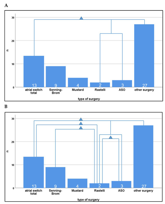 Comparison of patients with TGA (n = 18) to patients with other conotruncal anomalies (n = 22) or univentricular hearts (n = 4) revealed differences depending on the underlying disease and the type of cardiac surgery performed (Figure 1, Table 3).