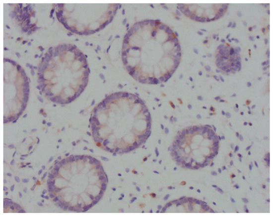 Immunohistochemical analysis was performed in the device Bench Mark ULTRA IHC/ISH Staining Module (Ventana, Tucson, AZ, USA) with positive control. After deparaffinization in xylol and rehydration through alcohol descending concentrations, the slices were cooked in EDTA pH 8.2 buffer for 10–30 min. Endogenous peroxidase was inactivated by incubation in H2O2. After that, the slices were washed out in phosphate buffer solution (PBS) and incubated in the primary antibody Anti-CD83 ab205343 (Abcam, Cambridge, UK) in a moist atmosphere for 32 min. After washing out in PBS, the slices were incubated in a system for secondary detection Ultraview Universal DAB DEtection Kit (Ventana, Tucson, AZ, USA). Stained samples were analysed using the light microscope Olympus BX41. In areas with the most intensive staining, intraepithelial mature CD83+ DCs were counted per 100 enterocytes (Figure 1).