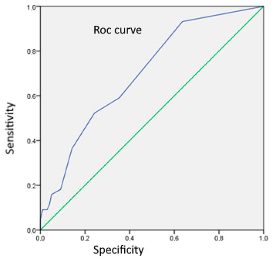 ROC analysis curve for assessment of number of CD83+ DC as a differentiation marker between UC and CD (area = 0.699; SE 0.046; p < 0.001; 95% CI: 0.609–0.788).