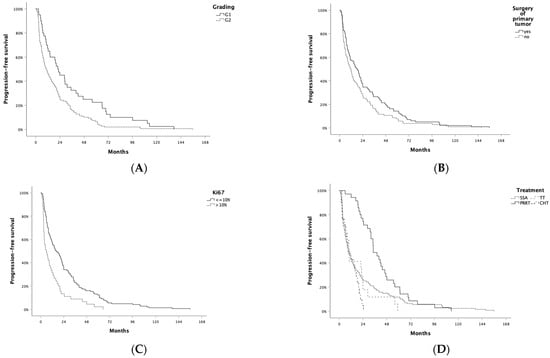 Progression-free survival to first-line treatment (PFS1) by (A) grading, (B) resection of primary tumor, (C) Ki67, and (D) type of first-line treatment. SSA: somatostatin analog; PRRT: peptide radionuclide receptor therapy; TT: targeted therapy; CHT: chemotherapy.