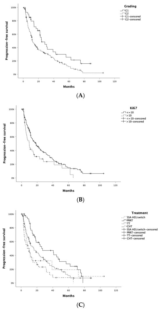 Ninety-four patients (46.8%) received SSA + targeted therapy, 35 chemotherapy (either TMZ- or oxaliplatin-based) (17.4%), 45 SSA + RLT (22.4%), and 27 SSA alone-based strategy (either non-conventional-dose SSA or switched SSA; 13.4%) as second-line treatment. Overall, median PFS to second-line treatment (PFS2) was 15.0 months (95% CI: 10.7–19.3 months), while ORR was 5.5%: 1 patient achieved CR and 10 PR. Significantly longer PFS2 was associated with grading (G1: 24.1 months [95% CI: 14.4–33.8] vs. G2: 12.0 months [95% CI: 9.2–14.8]; p = 0.006; Figure 2A), Ki67 ≤ 10% (18.4 months [95% CI: 12.5–24.3] vs. 9.9 months [95% CI: 6.2–13.6]; p = 0.025; Figure 2B) and type of therapy (SSA HD/switch 10.0 months; RLT 26.0 months; TT: 16.0 months; chemotherapy 7.7 months; p = 0.001; Figure 2C). No significant PFS2 difference according to sex (p = 0.232), presence of syndrome (p = 0.961), surgery of primary tumor (p = 0.141), or presence of extrahepatic metastatic disease (p = 0.204) was observed. A higher risk of progression to second-line treatment was associated with Ki67 > 10% (HR 1.54; p = 0.027), while a lower risk of progression was associated with second-line treatment with RLT as compared to other therapeutic strategies (Table 3). Sex, presence of symptoms related to hormone hypersecretion, surgery of primary tumor, and presence of extrahepatic metastatic disease were not associated with the risk of progression to second-line treatment. At multivariate analysis, type of second-line therapy was independently associated with the risk of progression (HD-SSA vs. RLT HR: 2.06; p = 0.019 and chemotherapy vs. RLT HR: 2.23; p = 0.003; Table 3).