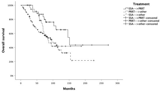 Overall survival (OS) by treatment sequence. SSA: somatostatin analog; PRRT: peptide radionuclide receptor therapy; Other includes targeted therapy, temozolomide-based or oxaliplatin-based chemotherapy, non-conventional doses SSA, or SSA switch.