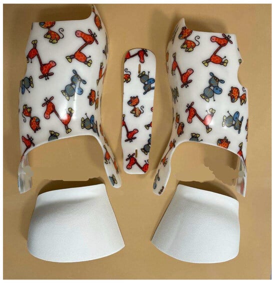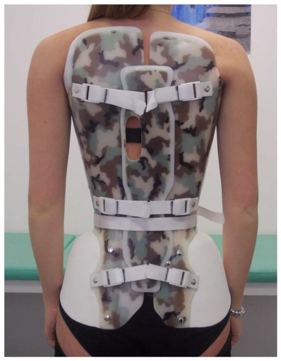 The SfB (Figure 3) has already been thoroughly described in previous publications [27]. According to the recently published classification of braces [11], it is a very rigid, push-up, three-dimensional, bivalve, ventral closure, thoraco–lumbo–sacral orthosis.