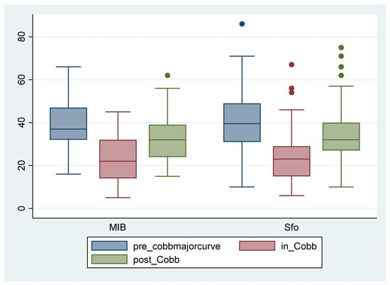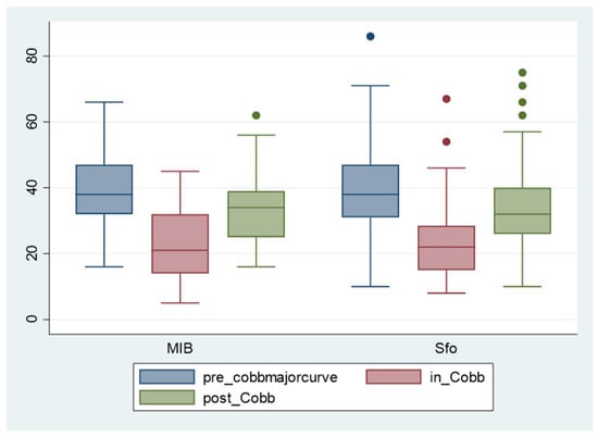Cobb degrees of the primary curve at T0 (blue), T1 (red), and T2 (green) in the two compared groups. Sfo: Sforzesco brace; MIB: Modular Italian brace (MI brace).