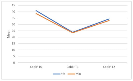 Mean Cobb degree values of primary curves at T0, T1 and T2. SfB: Sforzesco brace; MIB: Modular Italian brace (MI brace).
