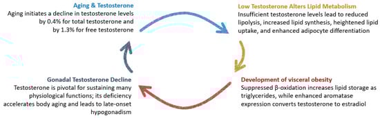 Clinical data linking obesity and ED are evident in the biochemical pathways, where testosterone plays a crucial role in mediating this relationship. The definition of hypogonadism in men pertains to testicular failure associated with androgen deficiency in the context of the physiology of the hypothalamus–pituitary–testis axis, which changes across various stages of a man’s life [12,13]. The analysis of data from the European Male Aging Study showed that concentrations of testosterone drop progressively by 0.4% for total testosterone and by 1.3% for free testosterone per year. Furthermore, a decrease in free testosterone level was significantly higher in men with obesity (by 5.09 nmol/L; p < 0.001), in comparison to normal-weight men [14]. The decreased testosterone levels during aging impact lipid metabolism in cells. Free fatty acids, either released into the bloodstream or obtained from lipoproteins, can be utilized for energy or stored as triglycerides within cells. When testosterone levels are insufficient, there is a reduction in lipolysis, an increase in lipid synthesis, heightened lipid uptake, and enhanced adipocyte differentiation. Additionally, lipids that would typically be broken down during the β-oxidation process are more likely to be stored as triglycerides than utilized for energy. Consequently, hypogonadal men experience a decrease in lean body mass and an increase in fat mass, particularly in the abdominal or central region [15]. Moreover, adipocytes exhibit a high expression of aromatase, an enzyme responsible for converting testosterone to estradiol. This enzymatic process leads to a decrease in circulating androgens. Simultaneously, estrogens, produced as a result of this process, function as part of a negative feedback mechanism on the hypothalamic–pituitary axis. This action suppresses gonadotropin-releasing hormones and, subsequently, luteinizing hormones, ultimately contributing to a decline in gonadal testosterone release [16]. The escalation of body weight fuels a vicious cycle by directly diminishing testosterone levels, thus reinforcing the development of obesity. The interplay of dependencies between the impact of aging on testosterone levels, the development of obesity, and the consequent negative effects on health is illustrated in Figure 1.
