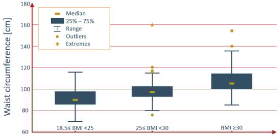 The correlation between waist circumference and IIEF-5 score was weak but significant (r = −0.20; p < 0.0001). The distribution of waist circumference values across BMI categories is illustrated in Figure 2.
