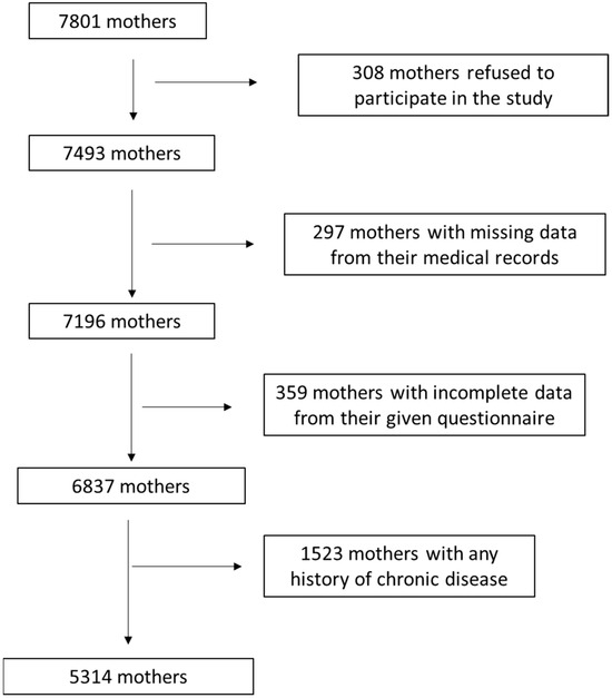 The current survey primarily included 7801 mothers from 12 different geographic Greek regions, rural and urban (Athens, Thessaloniki, Larissa, Kavala, Alexandroupolis, Ioannina, Patra, Kalamata, Korinthos, Crete, South and North Aegean). We initially enrolled any mothers presenting a singleton birth, independently of parity. In multiparous mothers (n = 1656, 31.2%), only their latest pregnancy was considered. Enrollment to the survey was carried out between May 2016 and September 2020. Women enrollment was conducted from the beginning of the 3rd to the end of the 6th month of gestation. The enrolled mothers were followed up for nine months after the birth. Figure 1 show in detail the flow chart diagram of the participants’ assignment. By using appropriate exclusion and inclusion criteria, 5314 mothers were finally involved, leading to a final response proportion of 68.1%.
