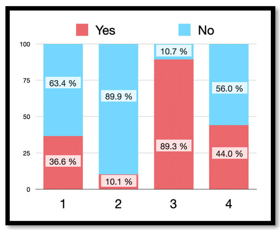 Figure 1 represents the patients’ perceptions of the need to take antibiotics before or after RCT. On the one hand, there were 178 respondents (34.6%) who thought it was necessary to take antibiotics before RCT. Similarly, this situation increased to 254 respondents (49.4%) who considered it necessary after RCT, regardless of symptoms. Among the respondents who considered it necessary to take antibiotics before RCT, the majority were women (n = 112; 33%); however, there were no significant differences with respect to sex (OR = 1.23; 95% CI = 0.84–1.80; p = 0.291) or the age of the participant (p = 0.969). On the other hand, there were significant differences with respect to educational level (p = 0.04); specifically, correct and better responses were observed in participants with a medium and high educational level.