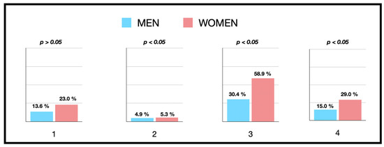 If we disaggregate the response by sex, men were more likely to seek a second opinion than women (women 8% versus men 14%; p = 0.024) (Figure 3). In addition, a higher second-opinion seeking was observed in patients under 30 years of age (p = 0.041).