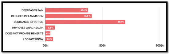 Participants could select more than one option regarding the benefits of antibiotics, the correct answer being a reduction in infection. The respondents’ beliefs about the potential benefits of antibiotic therapy are shown in Figure 4. A reduction in infection (n = 369, 69.8%) was the most selected benefit, followed by a reduction in inflammation (n = 208, 40.5%) and a reduction in pain (n = 191, 37.2%). There were no significant differences regarding sex, age and level of education (p > 0.05). With respect to age, it is observed that those over 40 consider that the use of antibiotics reduces the risk of infection (≤30 years 21.7% versus 30–40 years 17.0% versus ≥40 years 61.3%; p = 0.001). This constatement is repeated repeatedly in other questions such as pain reduction (p = 0.001), inflammation reduction (p = 0.001) and improved oral health (p = 0.050). With respect to the previous experience of the participants, the knowledge of the use of antibiotic therapy to reduce post-treatment infections increased (p = 0.002).