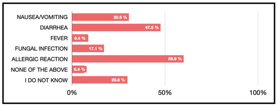 The answers to the question about the adverse effects of antibiotics are shown in Figure 5. Diarrhea (47.5%) was the adverse effect most cited by respondents, followed by allergic reaction (40.1%) and nausea/vomiting (30.5%).