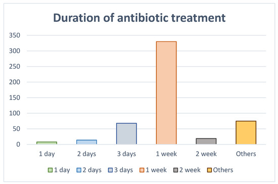 When asked about the duration they believed antibiotic treatment should last, the majority of respondents (n = 330, 64.1%) considered that it should be one week, and 13.2% (n = 68) considered that it should be 3 days (Figure 6).