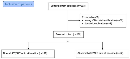 Two cohorts were retrospectively established: one with a normal AST/ALT ratio and another with an abnormal AST/ALT ratio. An abnormal AST/ALT ratio was defined as elevated transaminase levels (≥50 U/L in men and ≥35 U/L in female patients) with an AST/ALT ratio of ≥ 1 based on the traditional cut-off value for alcoholic liver disease [11].