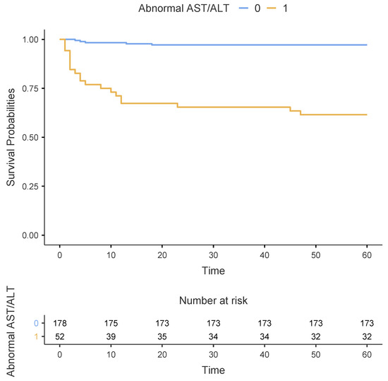As shown in Table 2, patients with an abnormal AST/ALT ratio had a significantly higher 60-day mortality rate than those with a normal AST/ALT ratio (38.5% vs. 2.8%, p < 0.001). This finding was confirmed using the Kaplan–Meier survival estimates, as depicted in Figure 2 (p < 0.001 using the log-rank test). Regarding the secondary outcomes, patients with an abnormal AST/ALT ratio had significantly higher incidence rates of shock (32.7% vs. 3.9%, p < 0.001), acute bleeding-related anaemia (42.3% vs. 18%, p = 0.001), acute kidney failure (40.4% vs. 16.3%, p < 0.001), and cardiac arrest (28.8% vs. 7.9%, p < 0.001) than those with a normal AST/ALT ratio. Patients with an abnormal AST/ALT ratio had significantly higher peak-BNP levels (3700 vs. 2550 pg/mL, p = 0.023) than those with a normal AST/ALT ratio. Furthermore, patients with an abnormal AST/ALT ratio were significantly more likely to receive inotropes or vasopressors (40.4% vs. 11.2%, p < 0.001), mechanical ventilation (61.5% vs. 16.9%, p < 0.001), dialysis (19.2% vs. 3.9%, p = 0.001), and ECLS (13.5% vs. 1.7%, p = 0.001) than those with a normal AST/ALT ratio.