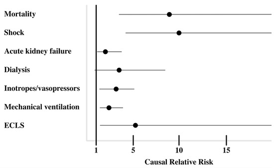 Causal relative risk of clinical outcomes after inverse probability weighting.