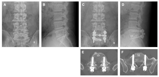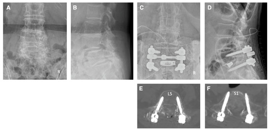 Illustrative case 1. (A,B) Preoperative X-ray shows narrowing of the disc space at the L5–S1 levels. (C,D) Postoperative X-ray shows pedicle screw fixation and TLIF at L5–S1 levels. (E,F) Postoperative CT images show that the pedicle screws were inserted appropriately.