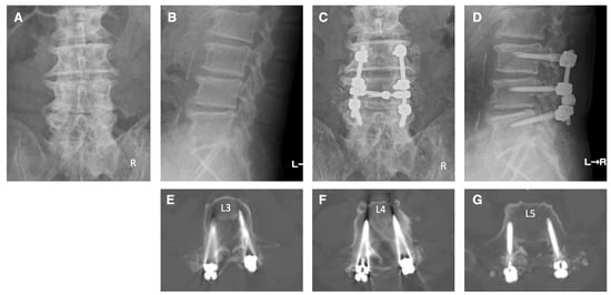 Illustrative case 3. (A,B) Preoperative X-ray shows facet joint hypertrophy and spur formation due to degenerative changes at multiple levels in the lumbar spine. (C,D) Postoperative X-ray shows pedicle screw fixation at the L3–5 levels and posterior decompression at L2–5 levels. (E–G) Postoperative CT images show that the pedicle screws were appropriately inserted.