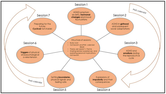 Figure 1. Overview of the female-specific treatment group for ADHD. The programme consists of 7 sessions of two hours that are given every other week, and all have their own focus. The PMS calendar functions as a connecting thread (Appendix A). All sessions have a similar structure. Every session starts with a 5 min body scan meditation. Homework and the PMS calendar are discussed. After a break, the content section consists of a combination of theory and (individual) experiences. Every session ends with the homework assignment for the next session. During the body scan, under verbal instruction from a therapist, participants are encouraged to move attention sequentially via the body, paying attention to present moment sensory experience in each body area without trying to change anything [48]. The PMS calendar was devised and adjusted in collaboration with participants of previous groups. For the duration of the group programme (about 16 weeks), participants use it to track their menstrual cycle, ADHD, mood, and somatic symptoms.