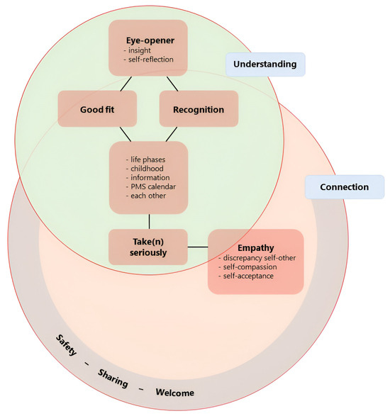 Figure 2. Graphical summary of themes from final evaluation and their interrelationship. Six key themes were identified via our qualitative analysis of the final evaluation: eyeopener, good-fit, recognition, take(n) seriously, empathy, and safety-sharing-welcome. We decided on a compound theme for safety-sharing-welcome as we felt that the separate meanings were similar enough to group but not identical enough to merge. All key themes are literal (translations of) expressions of our participants. The overarching themes, which overlap, are understanding and connection.